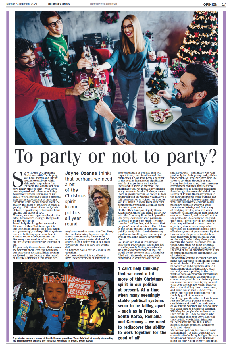 Jayne has become a regular columnist for the Guernsey Press. Her articles aim to blend local politics with national and international news, focusing on the values and challenges faced by all in positions of leadership.